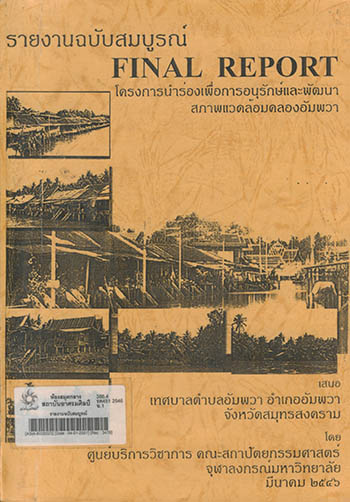 รายงานฉบับสมบูรณ์ โครงการนำร่องเพื่อการอนุรักษ์และพัฒนาสภาพแวดล้อมคลองอัมพวา / เสนอ เทศบาลตำบลอัมพวา จังหวัดสมุทรสงคราม ; จัดทำโดย ศูนย์บริการวิชาการ คณะสถาปัตยกรรมศาสตร์ จุฬาลงกรณ์มหาวิทยาลัย ; วรรณศิลป์ พีรพันธุ์, [หัวหน้าโครงการ] / ศูนย์บริการวิชาการ คณะสถาปัตยกรรมศาสตร์ จุฬาลงกรณ์มหาวิทยาลัย