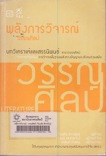 พลังการวิจารณ์ : วรรณศิลป์ / รื่นฤทัย สัจจพันธุ์ : ผู้วิจัย ; ชมัยภร แสงกระจ่าง และ อรพินท์ คำสอน : ผู้ร่วมวิจัย