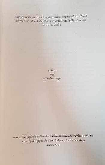 ชื่อเรื่องที่แตกต่าง  Effects of using graphic representational technique on the mathematical word-problem-solving performance of students with dyscalcula in Prathom Suksa Three