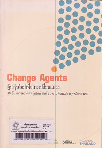 Change Agents ผู้นำรุ่นใหม่เพือการเปลี่ยนแปลง : 50 ผู้นำทางความคิดรุ่นใหม่ ที่พร้อมจะเปลี่ยนแปลงยุคสมัยของเขา /