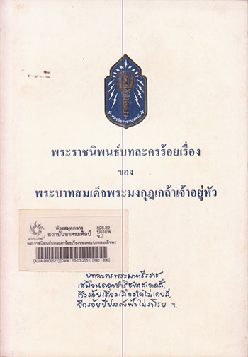 ชื่อเรื่องเพิ่ม  บทละครร้อยเรื่องของพระบาทสมเด็จพระมงกุฎเกล้าเจ้าอยู่หัว
