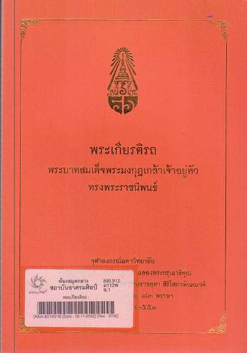 พระเกียรติรถ : จุฬาลงกรณ์มหาวิทยาลัยพิมพ์ทูลเกล้าทูลกระหม่อมถวาย ฉลองพระกรุณาธิคุณ สมเด็จพระเจ้าภคินีเธอ เจ้าฟ้าเพชรรัตนราชสุดา สิริโสภาพัณณวดี ในโอกาสฉลองพระชนมายุ 83 พรรษา 24 พฤศจิกายน 2551