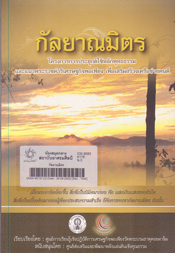 กัลยาณมิตร : โครงการการประยุกต์ใช้หลักพุทธธรรมและแนวพระราชดำริเศรษฐกิจพอเพียงเพื่อเสริมสร้างเครือข่ายคนดี / เรียบเรียงโดย ศูนย์ปฏิบัติธรรมเศรษฐกิจพอเพียง วัดพระบรมธาตุดอยผาส้ม