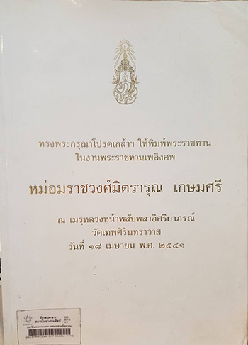 พระบาทสมเด็จพระเจ้าอยู่หัวทรงพระกรุณาโปรดเกล้าฯ ให้พิมพ์พระราชทานในงานพระราชทานเพลิงศพ ม.ร.ว.มิตรารุณ เกษมศรี ณ เมรุหลวงหน้าพลับพลาอิศริยาภรณ์ วัดเทพศิรินทราวาส วันที่ 18 เม.ย. 2541 |