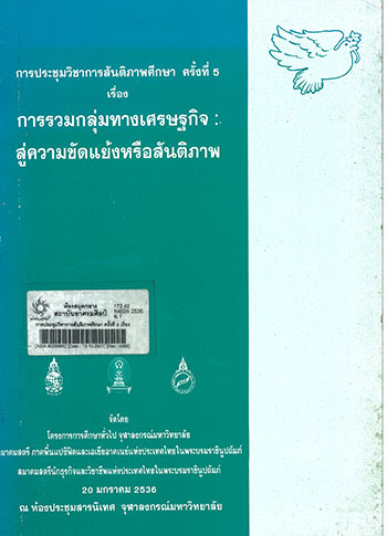 การประชุมวิชาการสันติภาพศึกษา ครั้งที่ 5 เรื่อง การรวมกลุ่มทางเศรษฐกิจ : สู่ความขัดแย้งหรือสันติภาพ 20 ม.ค. 2536 ณ ห้องประชุมสารนิเทศ จุฬาฯ / จัดโดย โครางการการศึกษาทั่วไป จุฬาฯ, สมาคมสตรีภาคพื้นแปซิฟิคและเอเชียอาคเนย์แห่งประเทศไทย, สมาคมสตรีนักธุรกิจและวิชาชีพแห่งประเทศไทย ; ศรีเพ็ญ ศุภพิทยากุล, บรรณาธิการ