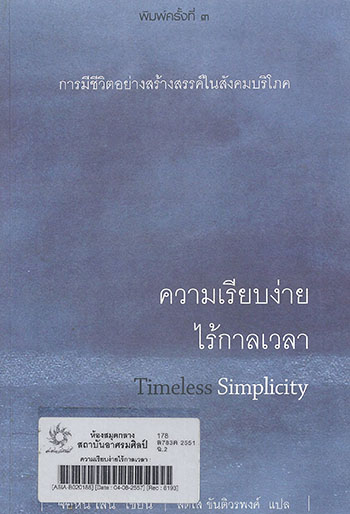 ความเรียบง่ายไร้กาลเวลา : การมีชีวิตอย่างสร้างสรรค์ในสังคมบริโภค = Timeless simplicity : creative living in a consumer society / จอห์น เลน, เขียน ; สดใส ขันติวรพงศ์, แปล