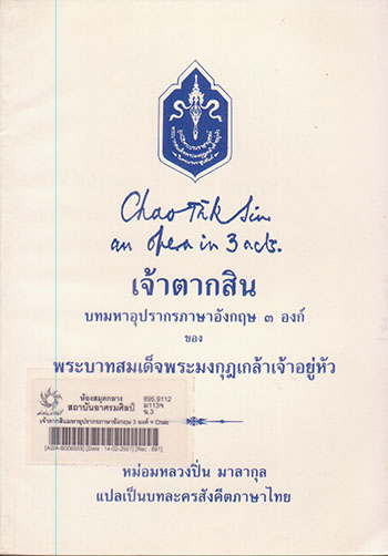 เจ้าตากสินมหาอุปรากรภาษาอังกฤษ 3 องค์ = Chao Thksin an opera in 3 acts / พระบาทสมเด็จพระมงกุฎเกล้าเจ้าอยู่หัว ; หม่อมหลวง ปิ่น มาลากุล แปลเป็นบทละครสังคีตภาษาไทย
