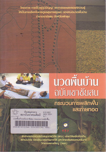 นวดพื้นบ้านฉบับเขาชัยสน กระบวนการพลิกฟื้น และถ่ายทอด / เรียบเรียงโดย ทีมวิจัยโครงการ การฟื้นฟูภูมิปัญญา และการขยายผลองค์ความรู้ให้เป็นทางเลือกในการดูแลสุขภาพชุมชนของหมอนวดพื้นบ้าน อำเภอเขาชัยสน จังหวัดพัทลุง ; บรรณาธิการ, กชกร ชิณะวงศ์