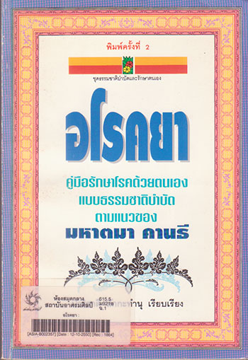 ชื่อเรื่องเพิ่ม  คู่มือรักษาโรคด้วยตนเองแบบธรรมชาติบำบัดตามแนวของมหาตมา คานธี